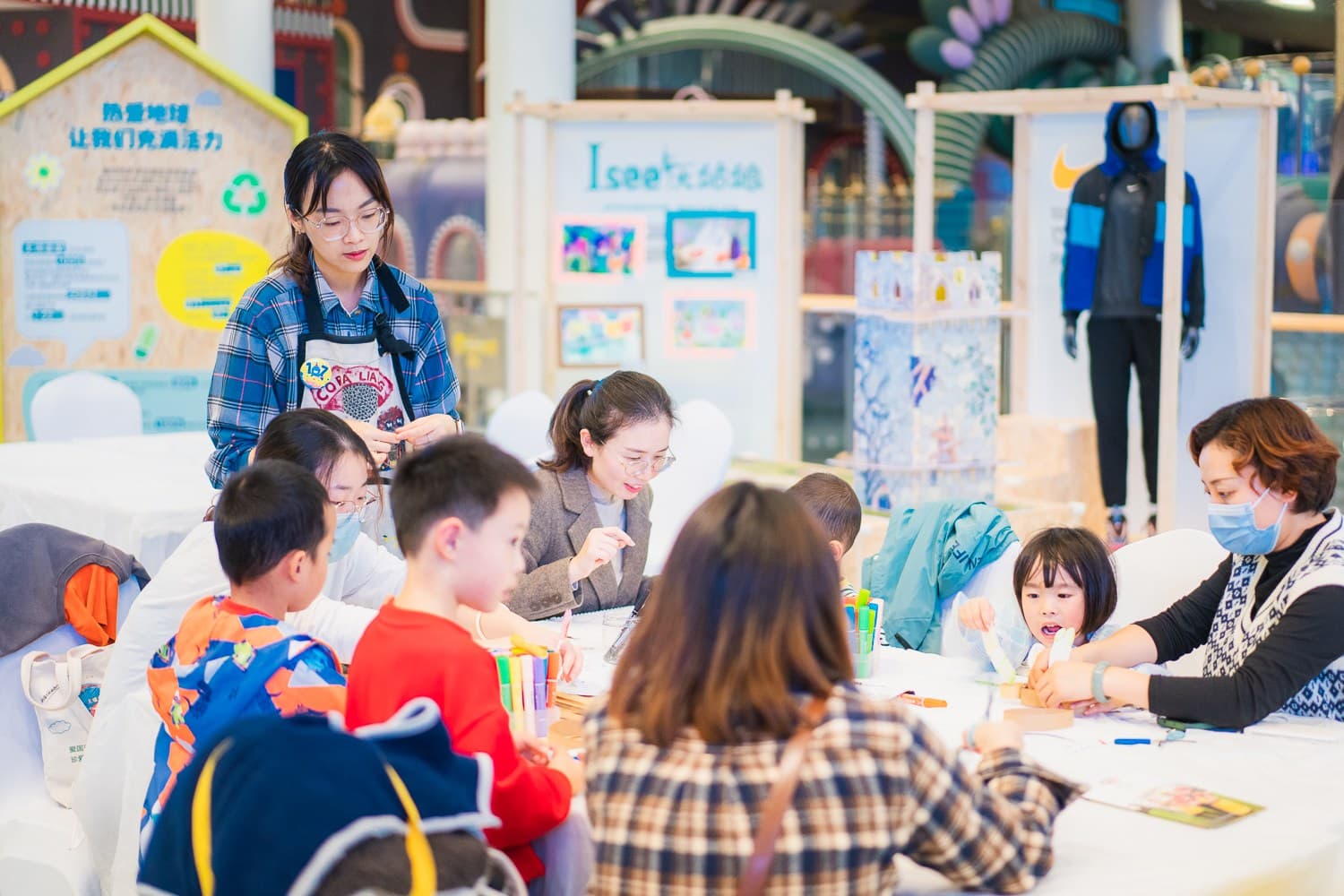 场内租户金宝贝及杨梅红带领孩子们利用生活中常见的可回收材料,发挥想象力和创造力,将“废物”变身独一无二的艺术品。